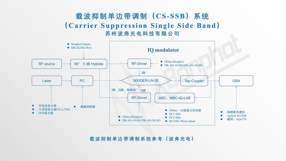 目前苏州威廉体育光电科技有限公司提供的基于法国iXblue公司的高消光比IQ调制器(MXIQER)、配合我们提供的驱动(DR-AN-10-HO/DR-AN-20-HO)以及偏置控制器(MBC-IQ-LAB-A1),可以实现>30dB(1000:1)载波抑制比,具有无可比拟的性能及优势。