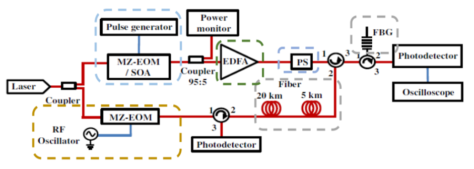 如下图,窄线宽激光器通过高消光比强度调制器(>40dB,系统可实现100dB高消光比),带宽~10.8GHz,经过脉冲调制,经过EDFA放大后,通过扰偏器消除偏振影响,再通过环形器实现远距离传输,和经过FBG滤波后,通过光电探测器解调和检波。