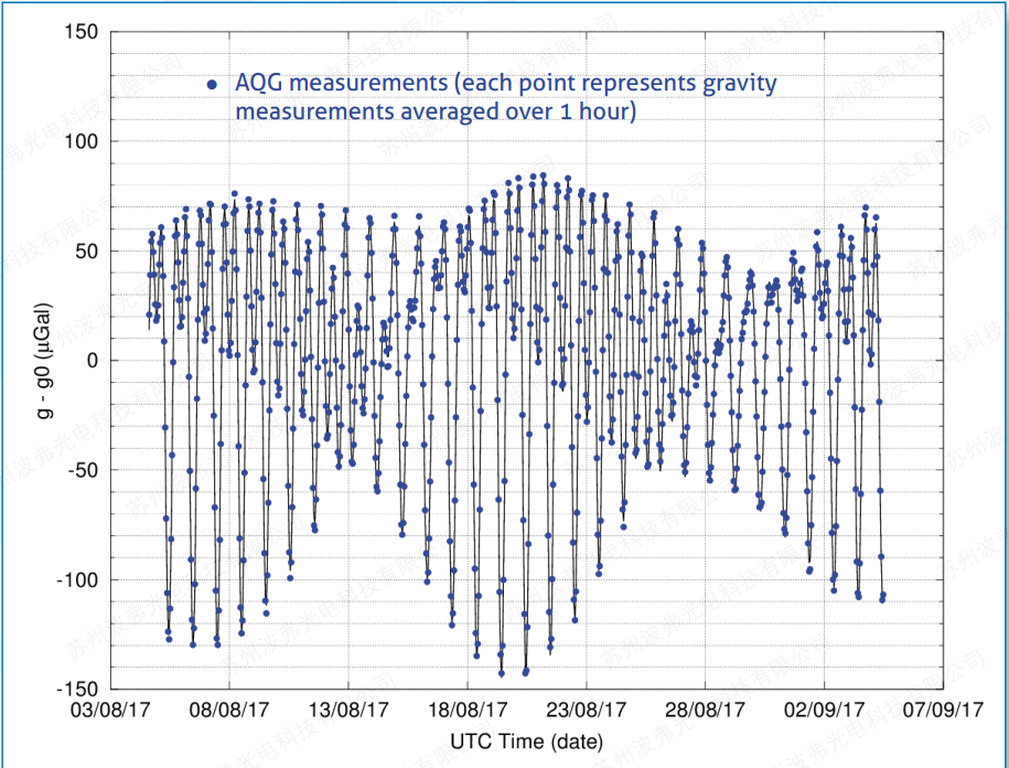 这个不间断的时间序列已经持续了一个月,并显示了当地的潮汐。当数据长期平均时持续时间,AQG 提供无漂移的亚 µGal 稳定性。